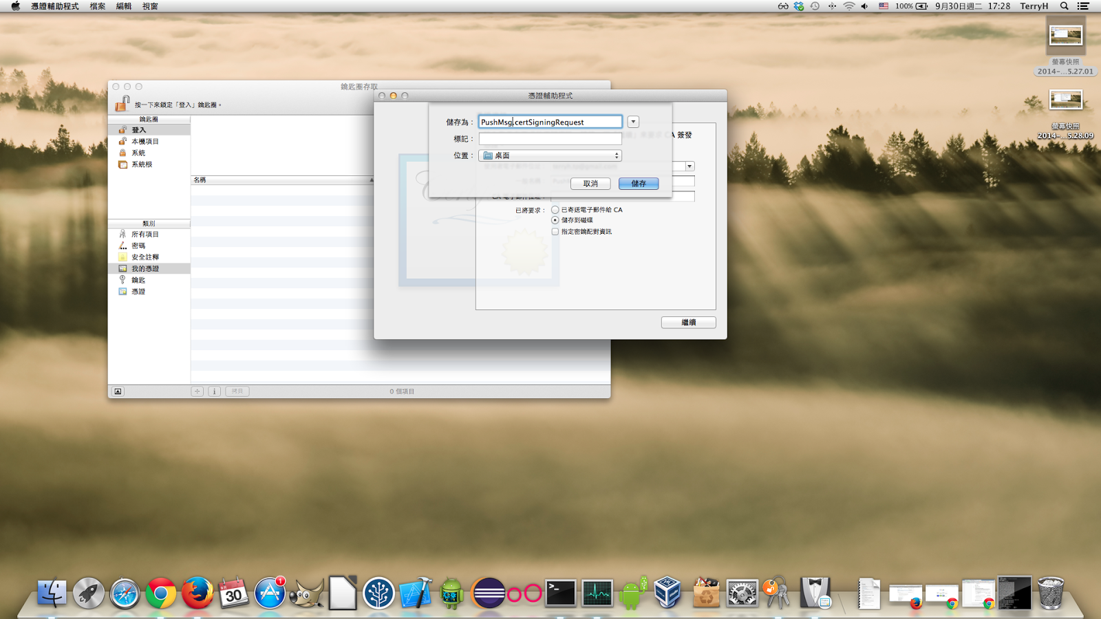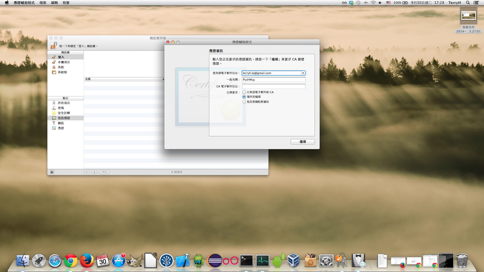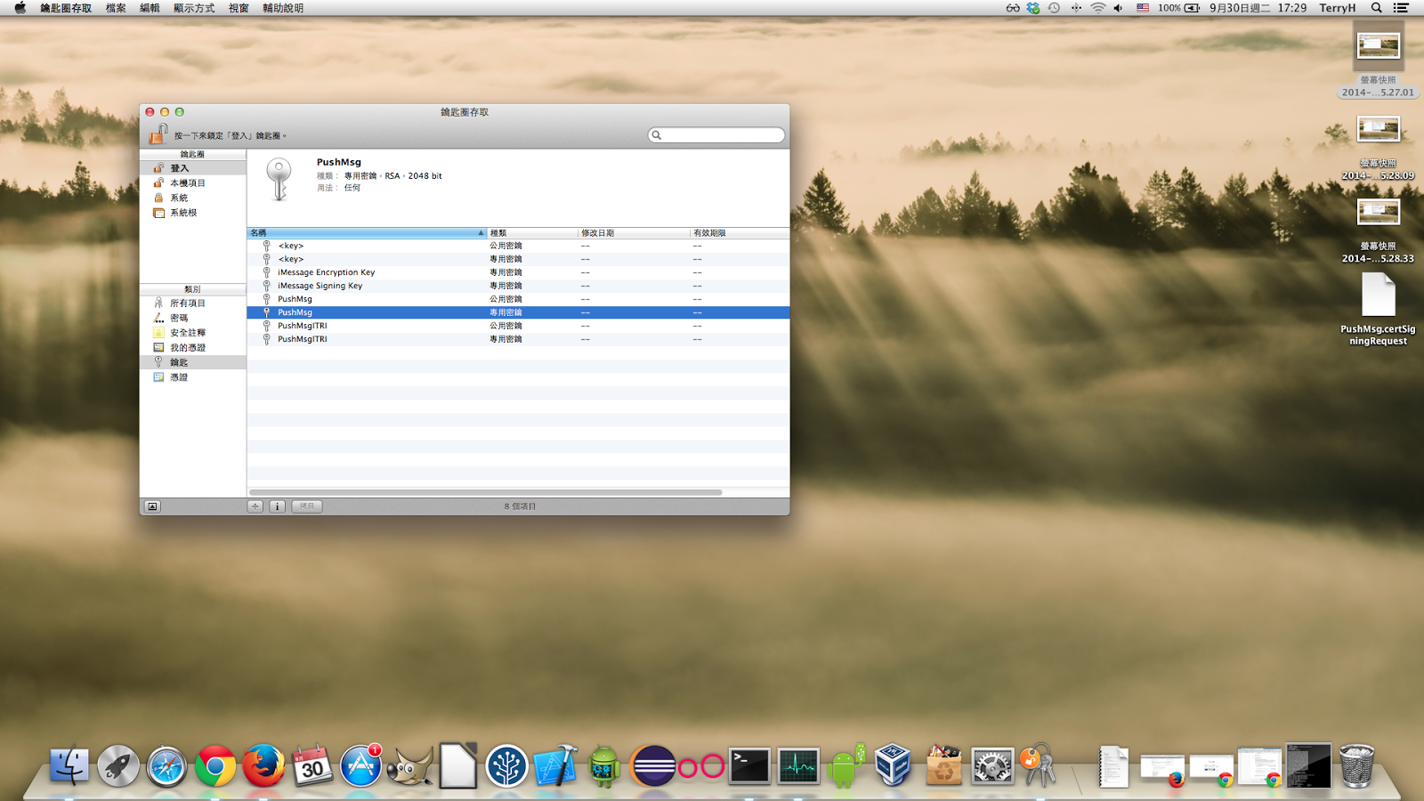 產生後,到鑰匙圈存取 應用程式,選鑰匙的地方,你會看到有 PushMsg 的公鑰和密鑰,點選專用密鑰,按下滑鼠右鍵輸出憑證,輸出成 PushMsg.p12 待會用